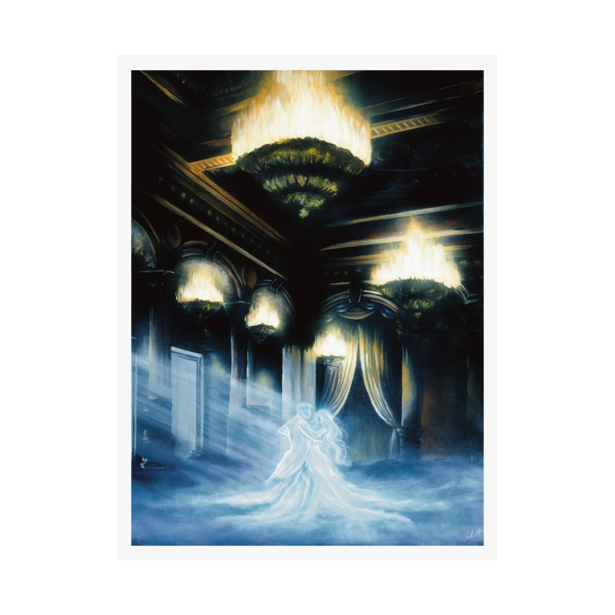 Under the glow of a forgotten chandelier, two souls find each other once more. Every year, on this very night, they return to the grand ballroom that once echoed with their laughter and vows. Their forms shimmer like memory, soft, fleeting, eternal, as they dance through the silence, bound not by life, but by love that refuses to fade.